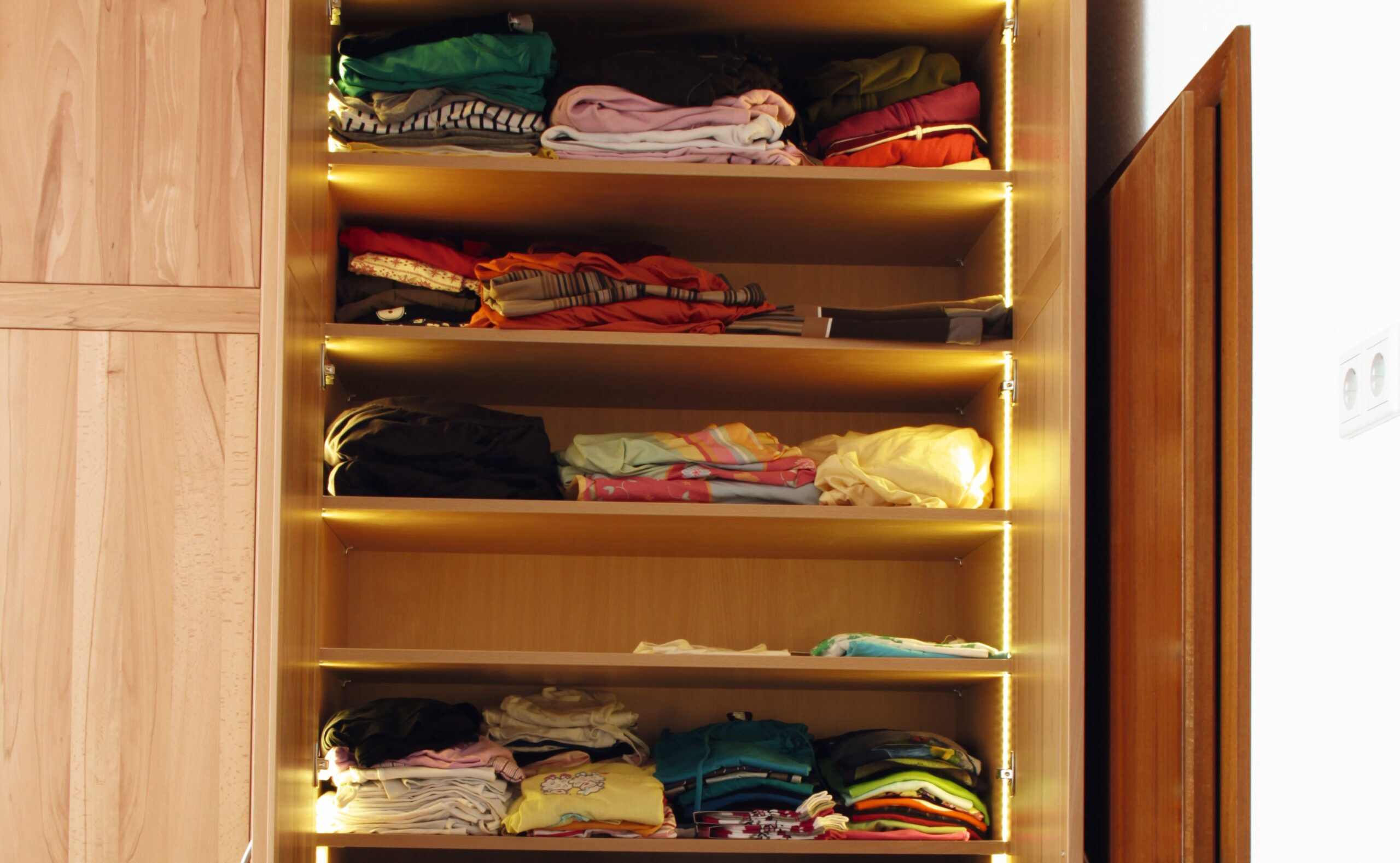 Kleiderschrank mit Rahmenfüllungstüren in Kernbuche, beleuchtete Fächer, Kleiderlift und ausziehbare Schubfächern
